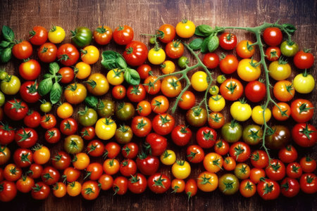 A vibrant array of cherry tomatoes in various shapes and sizes showcases a rich palette of colors. Perfect for food photography, cooking inspirations, and healthy lifestyle themes.