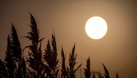 A bright, glowing sun is visible through silhouetted tall grass stalks in a hazy, muted sky.