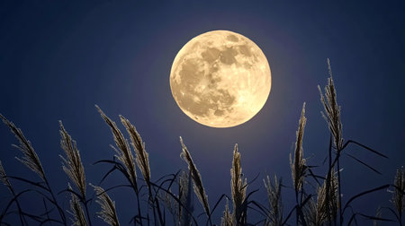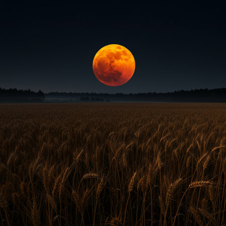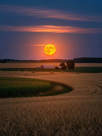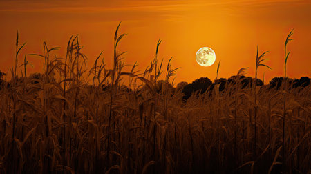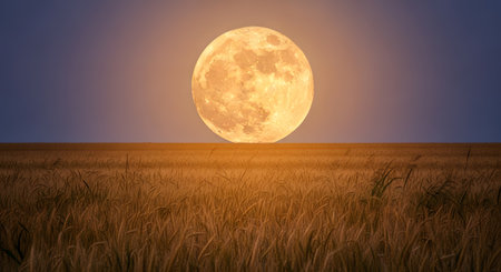 A close-up view depicts a field of ripe wheat under a full, luminous moon. The image showcases warm, golden tones contrasting with the dark night sky. It suggests a rural environment, potentially suitable for agricultural, nature, and harvest-related commercial applications or editorial content.