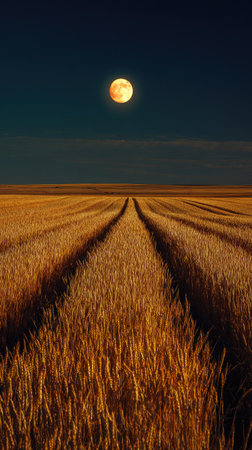 A vast field of golden wheat stretches towards the horizon under a dark night sky illuminated by a full moon. The composition features rows of wheat leading the eye. The lighting suggests a peaceful nighttime scene. Suitable for a variety of commercial and editorial applications.