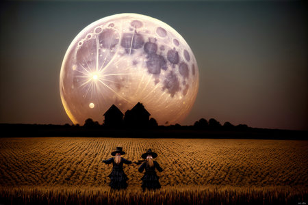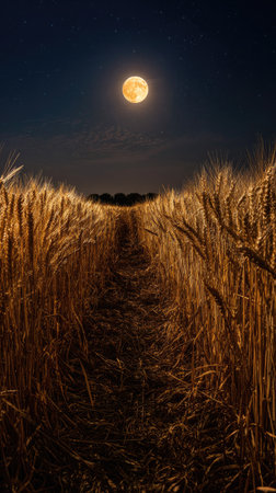 A nighttime landscape features a path leading through a field of wheat towards a full moon. The scene is illuminated with warm tones, possibly under a clear night sky. This image evokes feelings of tranquility and could be used for various commercial or editorial applications.
