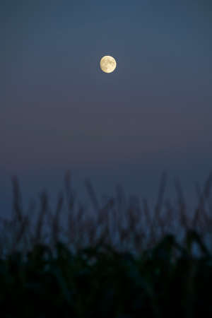 Fool moon at dusk in country fields and farmland in the south Backa district in Vojvodina, Serbia, Europe.