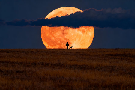 Full Orange Moon Over Silhouetted Grass Field at Night