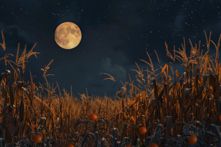 A full moon ascends above a field of mature corn, A harvest moon rising over a field of ripe cornstalks