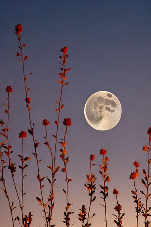Full moon over a blooming red flower meadow at sunset.