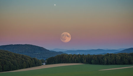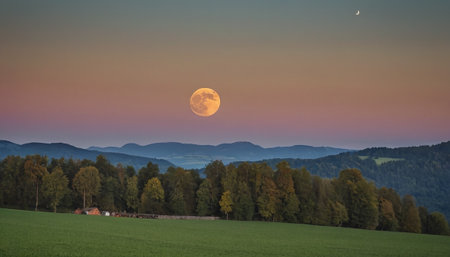 Beautiful landscape with a full moon in the sky and meadows