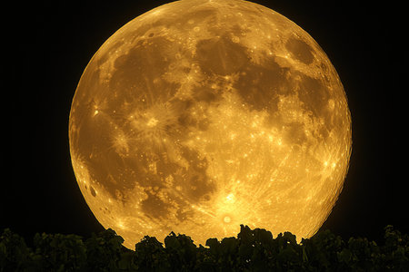 Golden moon in the dark night hanging over tree silhouettes on the blue night sky