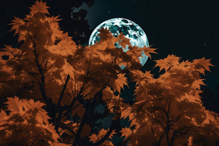 A vibrant full moon illuminates the scene through a network of autumn leaves. The composition features warm hues of orange and red contrasting with the cooler tones of the night sky. The photograph showcases a natural setting, suggesting a tranquil environment suitable for diverse applications.