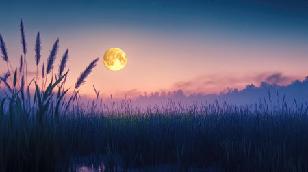 A tranquil scene featuring a large, glowing moon rising over a calm marshland at dusk, surrounded by silhouetted grass and a softly colored sky.