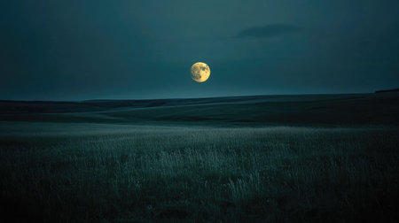 A tranquil full moon glowing softly above an empty field, with the dark sky adding to the stillness