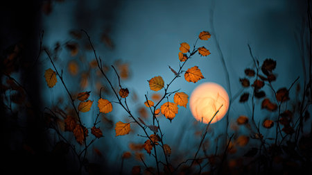 A full moon glows behind tree branches laden with orange fruit and autumnal foliage. The scene presents an interplay of warm and cool tones under a deep blue sky. The composition likely evokes a nighttime setting suitable for various illustrative and commercial applications.