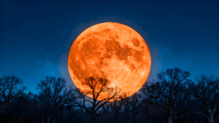 A striking visual captures a full moon against a deep, dark blue sky. The moon glows with a warm, orange hue, contrasted by silhouettes of branches in the foreground. This image, with its dramatic lighting, lends itself to various editorial and commercial applications.