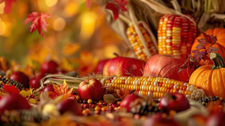 A close-up view of an autumn harvest, showing vibrant corn, pumpkins, and apples, arranged together in a field.