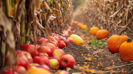 Fallen apples, pumpkins, and an ear of corn lay scattered on the ground amidst the rows of dry corn stalks.