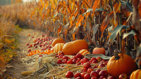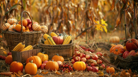 A field of corn stalks, pumpkins, apples, and grapes showcases the vibrant colors and bounty of autumn.