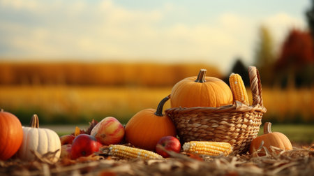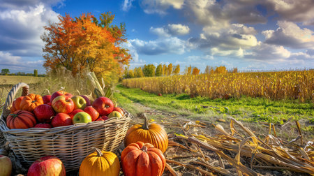 the fall harvest, with a focus on a basket of pumpkins, apples, and corn set against a backdrop of fields, trees, and a clear sky. Convey the essence of Thanksgiving's agricultural traditions