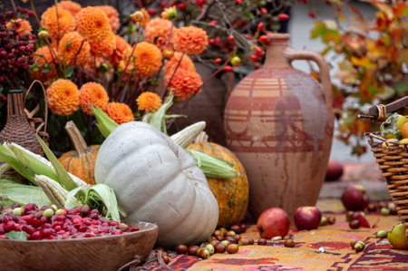 Harvested corn and dried fruits on the farm in autumn.