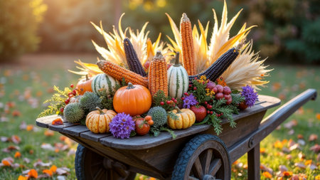 Autumn harvest display: pumpkins, gourds, corn, and fall foliage on wooden cart. That the image is generated using AI.