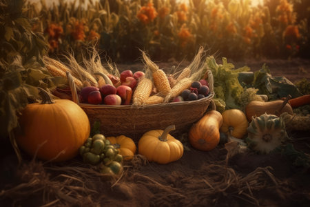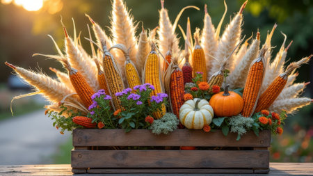 Autumn harvest arrangement with pumpkins, corn, and flowers in wooden crate at sunset. That the image is generated using AI.