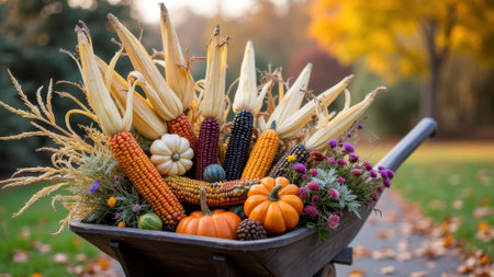 Autumn harvest display with diverse corn varieties and pumpkins in a wheelbarrow. That the image is generated using AI.