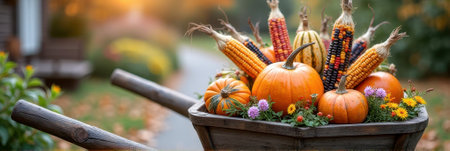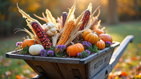 Colorful harvest wheelbarrow display with corn, pumpkins, and autumn foliage. That the image is generated using AI.