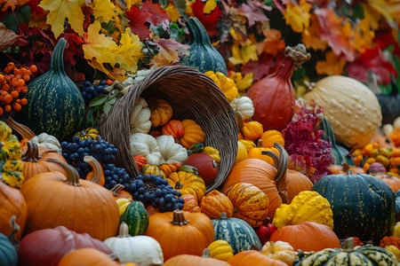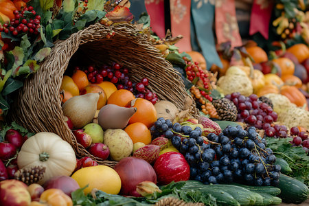 A colorful arrangement of fruits and vegetables spilling out of a wicker horn, symbolizing abundance and harvest.