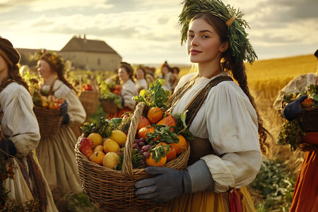 Generative AI Image of European Woman Traditional Cloth and Carry Fresh Harvested Fruit Festive