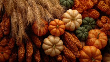Discover the beauty of autumn with a vibrant collection of pumpkins, decorative gourds, and golden wheat, capturing the essence of the harvest season.