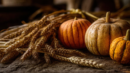 Celebrate the essence of autumn with this beautiful display featuring pumpkins and wheat, perfect for seasonal decoration and festive vibes.