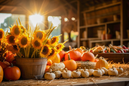 Autumn farm produce on display, with pumpkins, sunflowers, and gourds arranged in a captivating festive presentation