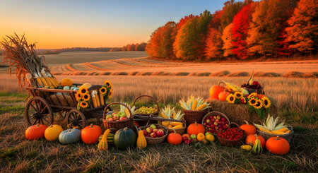 A rustic wooden cart and various baskets are filled with a bountiful autumn harvest, including pumpkins, corn, apples, and sunflowers. The scene is set in a golden field at sunset, with a background of colorful fall foliage, evoking feelings of abundance and Thanksgiving.