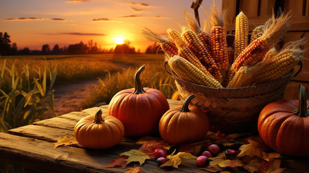 A vibrant autumn still life featuring a pumpkin, corn, and berries in a rustic basket. Thanksgiving theme.