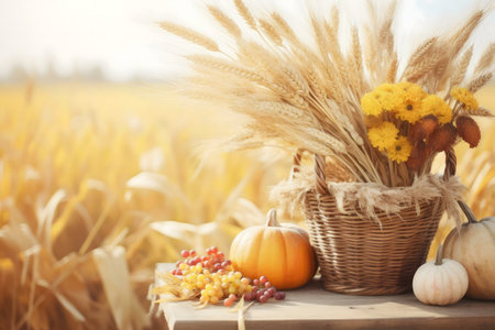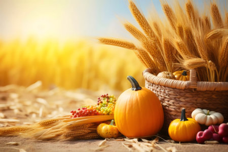 A picturesque autumn scene featuring pumpkins, wheat, and berries in a rustic basket against a sunlit field.