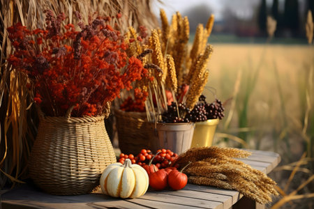 Rustic autumnal still life with pumpkins, wheat, dried flowers, and berries.