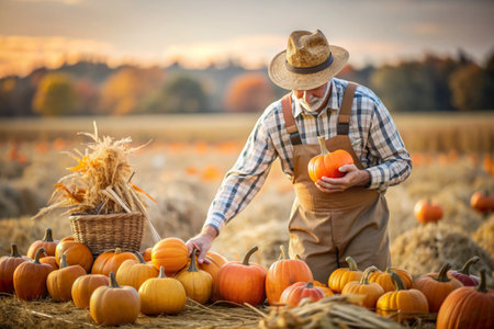 Farmer Organizing Freshly Harvested Autumn Pumpkins in Wooden Crates at Market