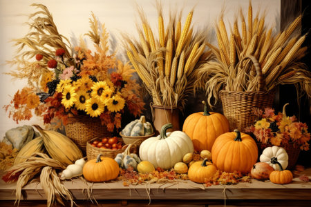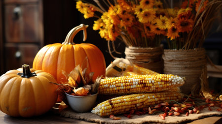 Harvest display with pumpkins, Indian corn, and autumn flowers. That the image is generated using AI.