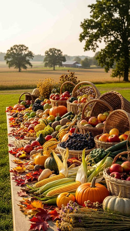 A heartwarming Thanksgiving background. Autumn landscape with golden leaves. A table adorned with an abundant harvest, a variety of fruits and vegetables. AI generated illustration