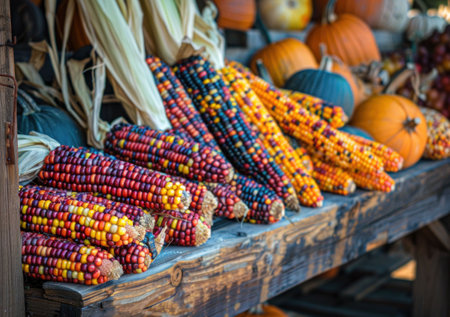 Colorful corn cobs and pumpkins display on rustic wooden table, autumn harvest concept