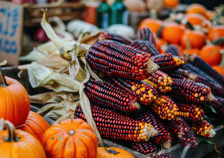 Colorful ears of corn and pumpkins at a vibrant farmer s market display in autumn