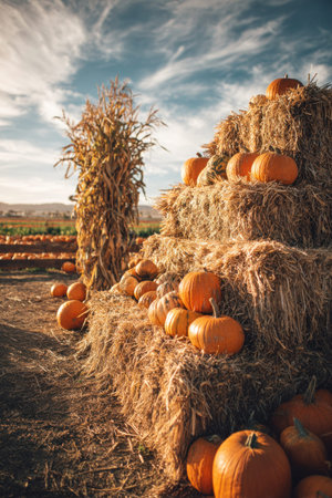 A wide shot of a harvest-themed Thanksgiving setup showcases stacked hay bales adorned with pumpkins, surrounded by a picturesque landscape, evoking a cozy autumn ambiance