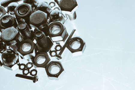 Art monochrome background from bolts and nuts close up in blue backlight. Handful fasteners in macro. Copy space.