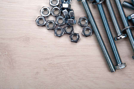 Steel nuts and bolts close-up on wooden table