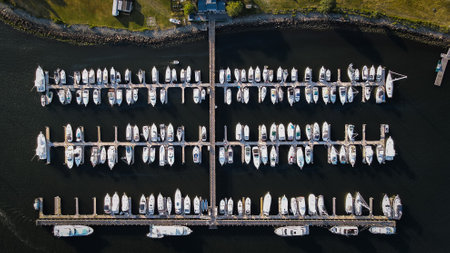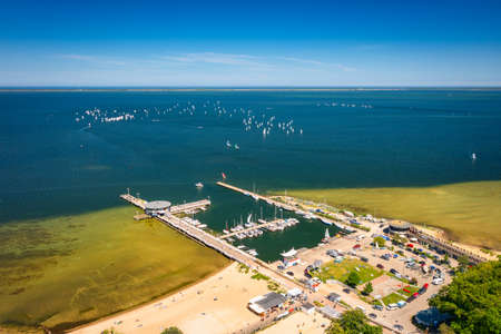Aerial view of Kent Narrows peninsula inlet on Chesapeake in Grasonville Maryland, beach houses with private long docks for the sailboats line a road curving like an S shape with blue sky and water