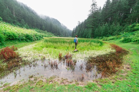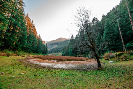 Kullu, Himachal Pradesh, India - September 02, 2018 : Grass covered punrik rishi lake surrounded by deodar tree