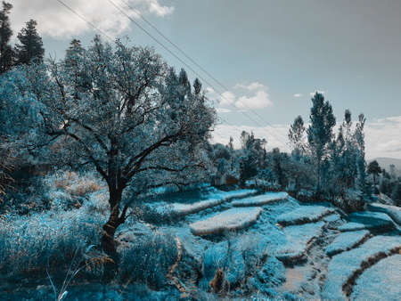 A beautiful landscape of fields in the mountains of Almora. A view of how terrace farming is done in Uttrakhand.