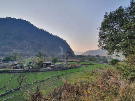 Terraced farming in Nepal. Village on a terraced hill during Annapurna Circuit Trek in Himalayas, Annapurna Conservation Area, Nepal. Rise fields. Agricultural concept. High quality photo