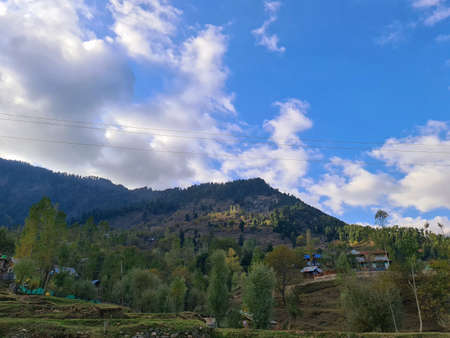 Fresh forest trees in forest on hills in the villages of jammu and kashmir india. Sky blue is also shining on the trees which looks to touch sky clouds and sun.