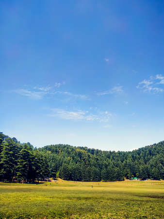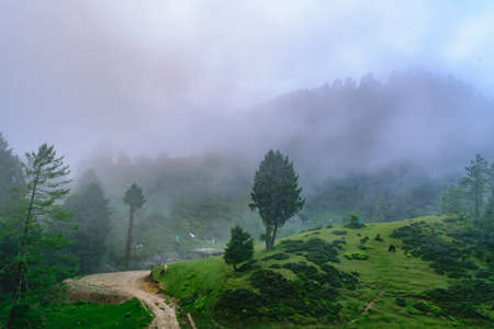 View of alpine meadows & coniferous enroute to Prashar Lake trekk trail. It is located at a height of 2730 m above sea level surrounded by lesser himalayas peaks near Mandi, Himachal Pradesh, India.