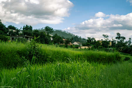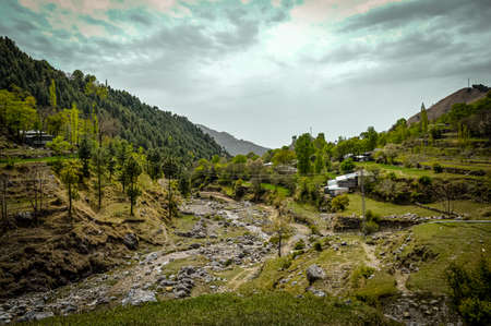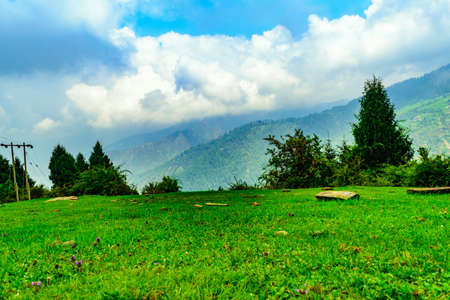Kashmir beauty green hills forests in mountains. summer landscape with green grass on the hills. nature scenery on a sunny day with clouds on the sky