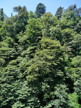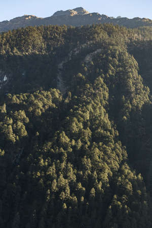 Green trees on the mountain with sunlight in the morning at Lachen in North Sikkim, India.